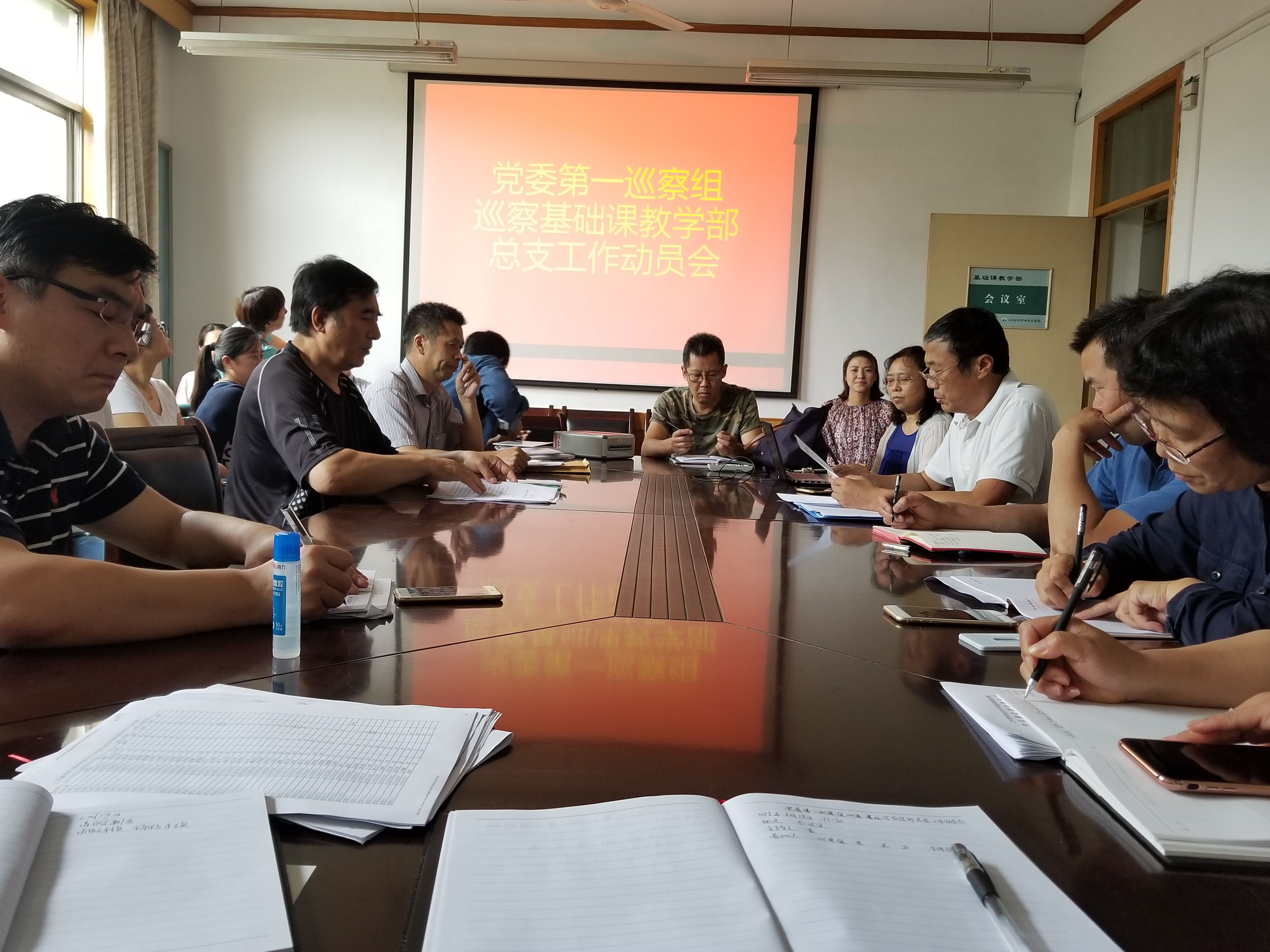 党委第一巡察组副组长汪玉静及巡察组全体成员,基础课教学部总支班子成员,基础部全体教职工参加会议。