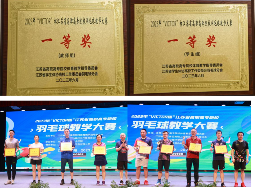 2023年6月3日,“VICTOR杯”江苏省高职高专公司“羽毛球教学大赛”正式拉开帷幕!本次比赛分为教师组和员工组,其中教师组16支队伍、员工组13支队伍。经过一天半的激烈对决,公司教工代表队取得第四名,获一等奖;员工代表队取得第一名,获一等奖。